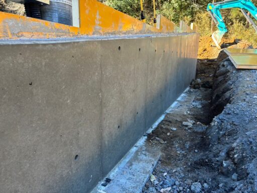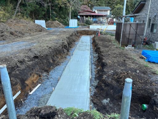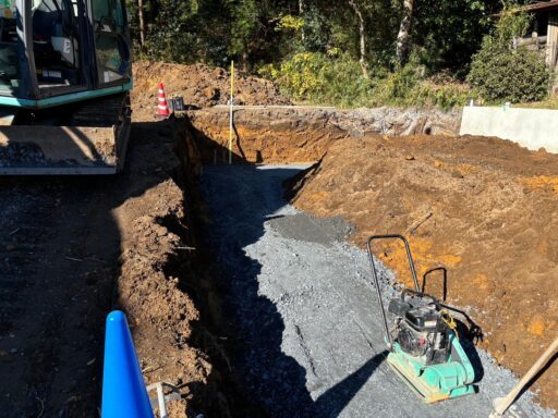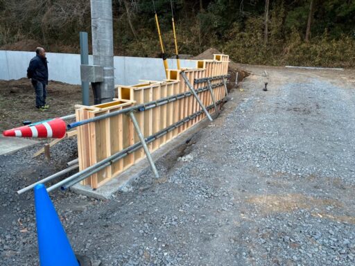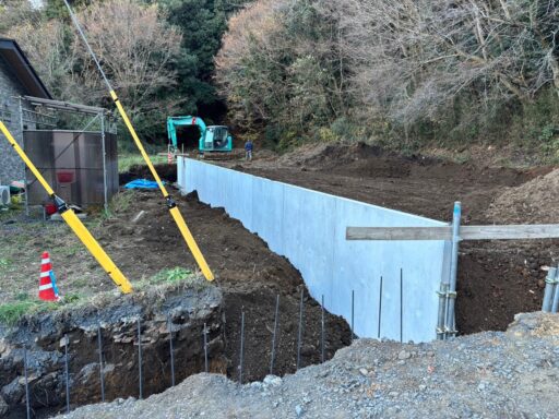道路より一段高くなった敷地を有効活用するため、まず土留め擁壁の設置から計画した現場です。
